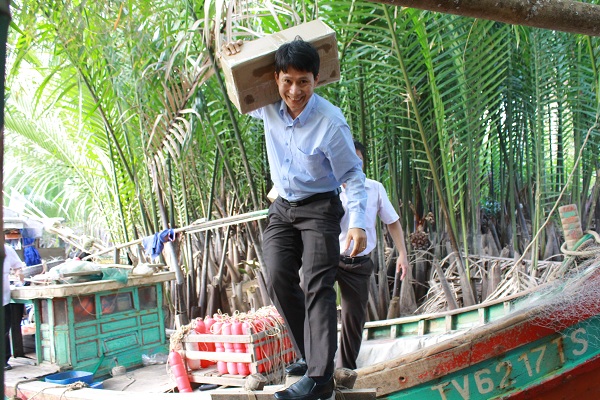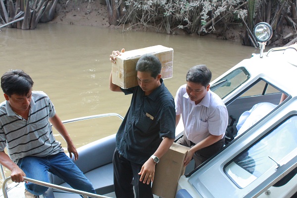 Đoàn công tác đã vượt qua nhiều phương tiện để đưa sách pháp luật đến Cù lao Long Trị