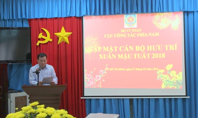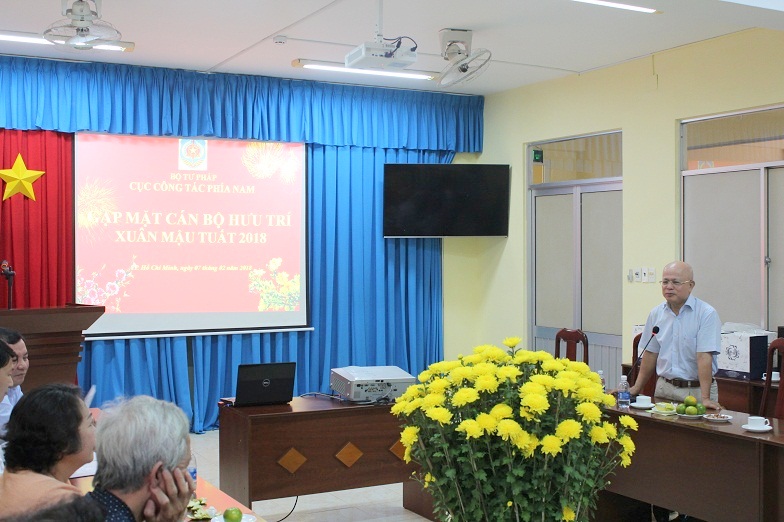 Thay mặt Lãnh đạo Cục Công tác phía Nam, Cục trưởng Nguyễn Thanh Bình chào mừng các đồng chí cán bộ hưu trí đã đến dự buổi gặp mặt, kính chúc các đồng chí luôn dồi dào sức khỏe là chỗ dựa vững chắc về tinh thần và tiếp tục đóng góp trí tuệ, kinh nghiệm của mình cho sự phát triển của ngành Tư pháp. Cục trưởng cũng thông tin tới các cán bộ hưu trí về tình hình, kết quả công tác năm 2017 và phương hướng công tác năm 2018 của Bộ Tư pháp, Cục Công tác phía Nam, đồng thời mong muốn tiếp tục nhận được sự quan tâm, chia sẻ kinh nghiệm của thế hệ cán bộ đi trước để công tác của Ngành ngày càng phát triển.