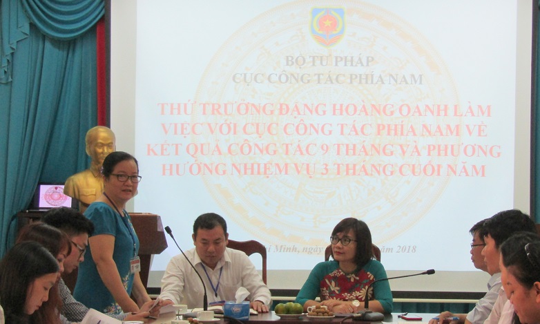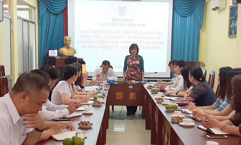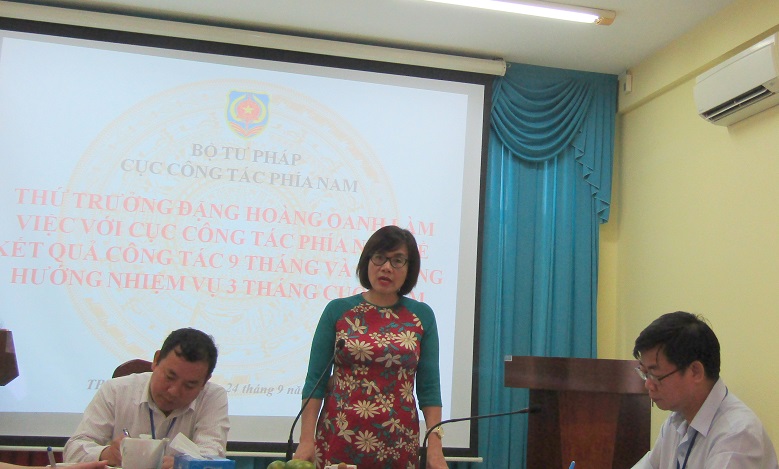 Tại buổi làm việc, Cục Công tác phía Nam đã báo cáo Thứ trưởng tình hình công tác 9 tháng đầu năm và phương hướng, nhiệm vụ đến cuối năm 2018 của Cục. Cụ thể, Cục Công tác phía Nam đã tổ chức thành công 03 Tọa đàm liên quan đến công tác tư pháp, Thi hành án dân sự và đặc biệt là Hội nghị giao ban khu vực phía Nam về công tác tư pháp do Bộ trưởng Bộ Tư pháp và Chủ tịch Ủy ban nhân dân tỉnh Hậu Giang đồng chủ trì, ghi nhận nhiều ý kiến trong các lĩnh vực về tổ chức cán bộ, sắp xếp tổ chức bộ máy, bổ trợ tư pháp, hành chính tư pháp... của 25 địa phương trong khu vực; tham gia, phục vụ nhiều chuyến công tác của Lãnh đạo Bộ tại khu vực phía Nam; thực hiện theo dõi công tác tư pháp, thi hành án dân sự...