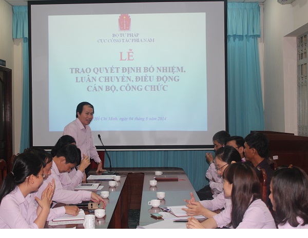 1. Trao Quyết định của Bộ trưởng Bộ Tư pháp về việc điều động, bổ nhiệm công chức giữ chức vụ lãnh đạo và biệt phái công chức đối với ông Huỳnh Văn Tam, nguyên Cục trưởng Cục Thi hành án dân sự tỉnh (THADS) Kiên Giang đến công tác tại Tổng cục THADS Bộ Tư pháp và bổ nhiệm Ông giữ chức vụ Phó Vụ trưởng Vụ Nghiệp vụ 1 Tổng cục THADS kể từ ngày 01/8/2014. Đồng thời, biệt phái ông Huỳnh Văn Tam, Phó Vụ trưởng Vụ Nghiệp vụ 1 Tổng cục THADS đến công tác tại Cục CTPN từ ngày 01/8/2014.