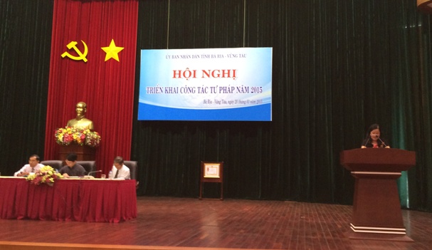 Phát biểu chỉ đạo tại Hội nghị, đồng chí Huỳnh Thị Lệ Thủy, Phó Cục trưởng Cục Công tác phía Nam Bộ Tư pháp và đồng chí Nguyễn Thanh Tịnh, Phó Chủ tịch UBND tỉnh đánh giá cao những kết quả mà toàn Ngành Tư pháp tỉnh Bà Rịa - Vũng Tàu đã đạt được trong năm qua, đồng thời nhấn mạnh những nhiệm vụ trọng tâm cần đẩy mạnh thực hiện trong năm 2015 như: tiếp tục triển khai kế hoạch thi hành Hiến pháp của Trung ương cũng như địa phương, tham mưu tổ chức thực hiện tốt cuộc thi viết “Tìm hiểu Hiến pháp nước CHXHCN Việt Nam”; Tăng cường công tác kiểm tra, đôn đốc, gắn kết công tác xây dựng, ban hành văn bản pháp luật với việc tổ chức thi hành pháp luật; Tập trung triển khai có hiệu quả công tác quản lý nhà nước về kiểm soát thủ tục hành chính, xử lý vi phạm hành chính, theo dõi thi hành pháp luật… ;Tiếp tục đẩy mạnh cải cách thủ tục hành chính, ứng dụng công nghệ thông tin; Nâng cao hiệu quả quản lý nhà nước trong công tác hành chính tư pháp và bổ trợ tư pháp; Kiện toàn bộ máy của Sở, triển khai nhiệm vụ được giao một cách có hiệu quả; tăng cường đào tạo, bồi dưỡng cán bộ, công chức, viên chức nhằm nâng cao trình độ chuyên môn, nghiệp vụ…