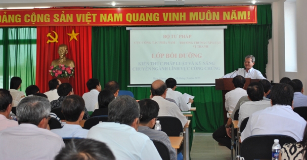 Tham dự lớp bồi dưỡng có bà Huỳnh Thị Lệ Thủy, Phó Cục trưởng Cục Công tác phía Nam Bộ Tư pháp, ông Phan Văn Cheo, Chủ tịch Hội Công chứng thành phố Hồ Chí Minh, Chủ tịch hội đồng thành viên Văn phòng Công chứng Sài Gòn, đồng thời cũng là 02 báo cáo viên lớp bồi dưỡng và ông Nguyễn Văn Phụng, Q. Hiệu trưởng Trường Trung cấp Luật Vị Thanh.