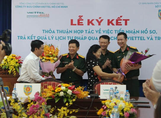 Tại Lễ ký kết, Đại tá Hoàng Quốc Anh - Phó Tổng Giám đốc Công ty bưu chính Viettel cho biết, ngoài phương thức nộp hồ sơ và nhận kết quả cấp Phiếu lý lịch tư pháp trực tiếp tại Sở Tư pháp thành phố Hồ Chí Minh thì cá nhân, tổ chức doanh nghiệp có thể lựa chọn một trong các hình thức đăng ký sau: (i) Đăng ký trực tiếp tại Sở Tư pháp thành phố Hồ Chí Minh và chọn sử dụng dịch vụ trả kết quả qua Bưu chính Viettel Hồ Chí Minh. (ii) Đăng ký trên trang trực tuyến http://www.lltptructuyen.moj.gov.vn chọn tiếp nhận hồ sơ và trả kết quả tại nhà qua bưu chính Viettel. (iii) Đăng ký tại các điểm giao dịch của Bưu chính Viettel thành phố Hồ Chí Minh. Như vậy, việc triển khai thực hiện Đề án thí điểm sẽ mang lại nhiều “lợi ích vượt trội” cho người dân như: Tiết kiệm thời gian, chi phí đi lại của cá nhân, tổ chức, doanh nghiệp khi có nhu cầu cấp phiếu lý lịch tư pháp.